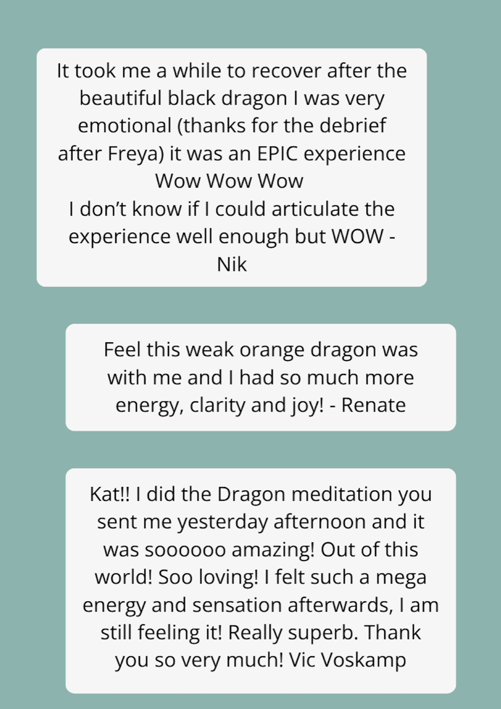 The dragon meditations are super powerful and bring me a lot of peace, love and fun! In the meditations Katelijn teaches me how to monitor my own energy, raise my own consciousness and self-love. Because of these meditations, I feel a much more balanced and happier person and the people that surround me, give me that same feedback. Very Grateful!